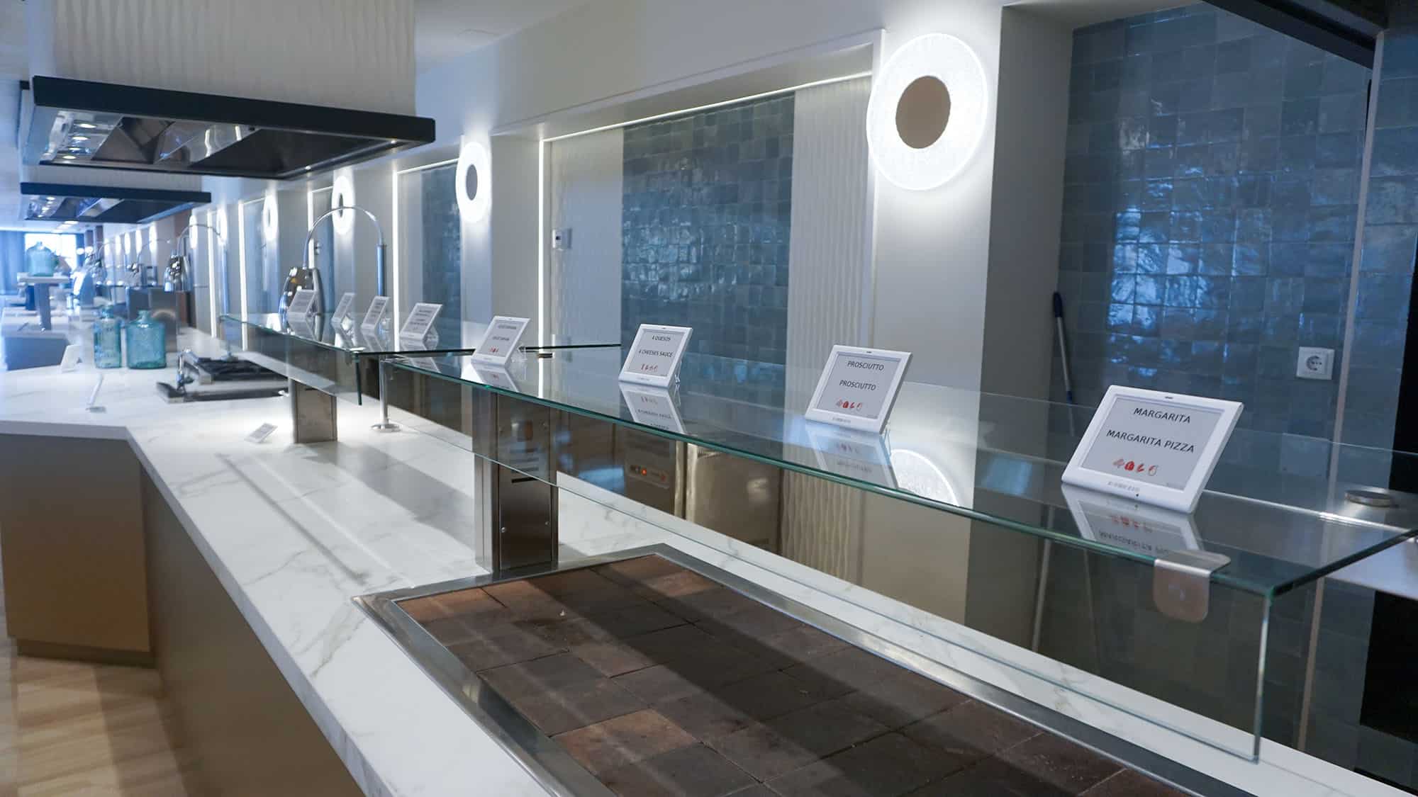 Cada vez más hoteles optan por reestructurar la distribución de sus buffets con el objetivo de aprovechar al máximo su espacio y mejorar la organización de los platos. Es crucial disponer los platos de manera que los huéspedes puedan acceder a ellos con facilidad, al mismo tiempo que se les brinda información detallada sobre el contenido de cada uno. Para ello, se deciden instalar Etiquetas Electrónicas, la cuales se posicionan sobre el plato y muestran información personalizada según necesidad. Muestran el nombre del plato en diferentes idiomas (español, inglés…), muestran información sobre los alérgenos presentes en cada plato (necesario para cumplir con la Ley de Información Alimentaria), etc.