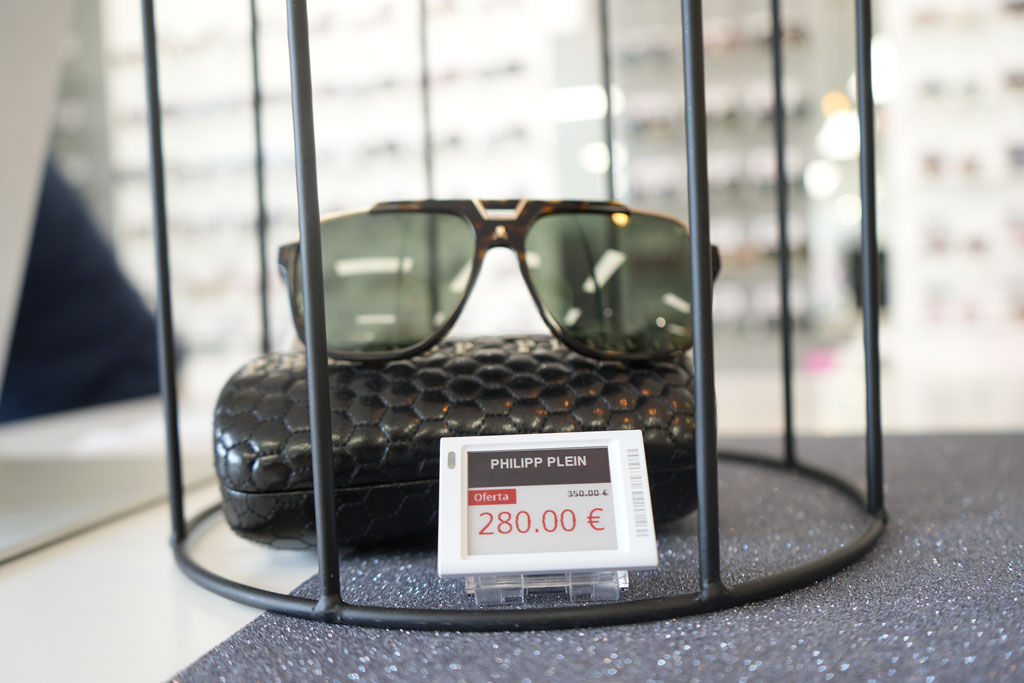 En ese caso, se instalaron Etiquetas Electrónicas de 2,9 y 1,8 pulgadas junto a las más de 300 gafas ofertadas en el establecimiento. En las etiquetas se puede mostrar la información que desee el cliente, en este caso se mostró el nombre de la marca, % de descuento, coste actual del producto y su coste anterior. También optaron por etiquetas de 4,2″ para mostrar el logo de la marca con el mensaje de «feliz navidad» y una promoción vigente en ese momento «-20% en todas las gafas de sol». Además, aunque no fueron seleccionadas en este caso, existen otras opciones de etiquetas de mayor tamaño cómo las de 7,5″, 11,6″ y 13,3″.